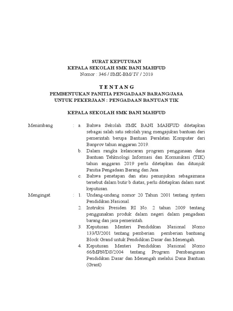 Menunjuk panitia pemeriksa barang pengadaan. Tentang pembentukan panitia pengadaan barang/jasa kegiatan perluasan dan peningkatan mutu smp kabupaten. Surat keputusan ini mulai berlaku sejak tanggal ditetapkan sampai berakhirnya . Pemberi layanan pos bantuan hukum di pengadilan perlu dibentuk panitia seleksi. Pedoman pengadaan barang dan jasa peraturan presiden nomor 16 tahun 2018.