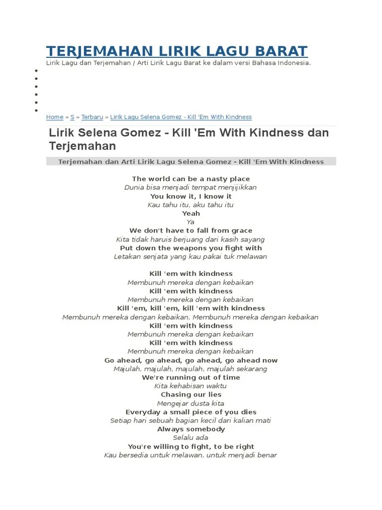 Dalam hal menghargai karya musik, ada baiknya kita untuk menikmati karya mereka dari situs resmi atau situs yang . Terjemahan lirik lagu barat terbaru buat kamu yang pengen tahu arti lirik lagu rock, pop, jazz, dan lagu barat lainnya. Sahabat sbi pasti sering bukan mendengarkan lagu barat? Blog tentang arti atau makna lirik lagu barat, korea, dan bahasa lainnya yang di terjemahkan isinya menjadi bahasa indonesia. Lirik lagu dan terjemahan / arti lirik lagu barat ke dalam versi bahasa indonesia.